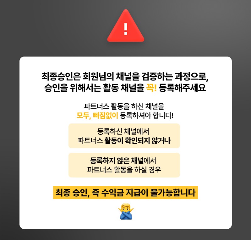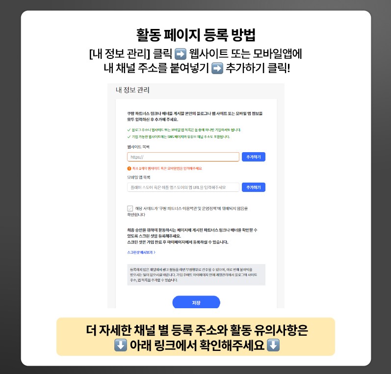 쿠팡 파트너스 최종 승인을 받기 위해서는 본인이 활동하는 채널을 꼭! 등록해주셔야 합니다.
